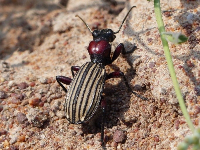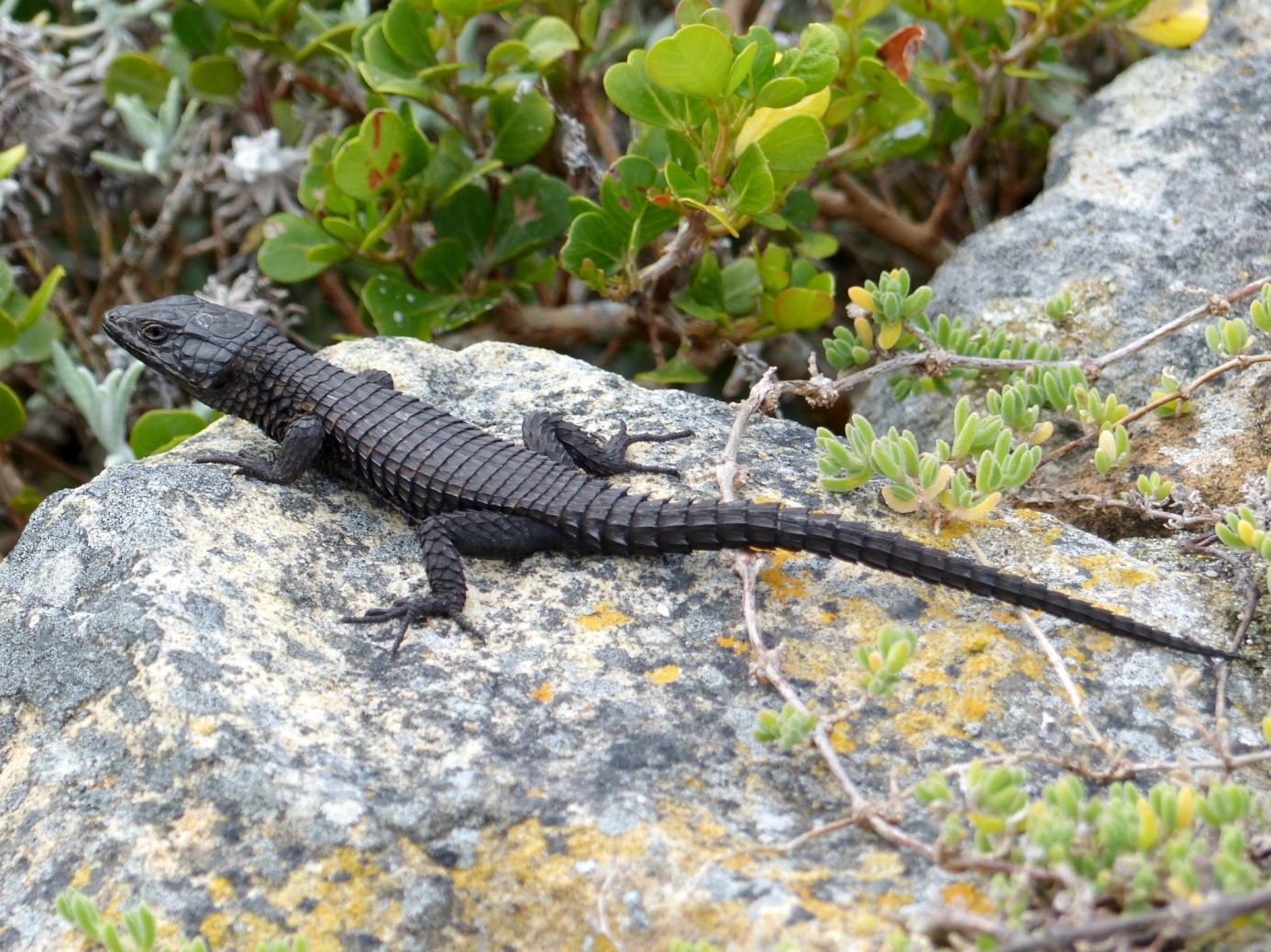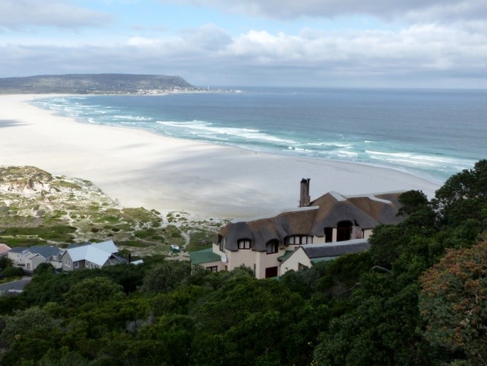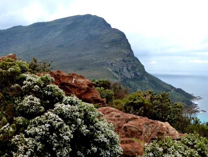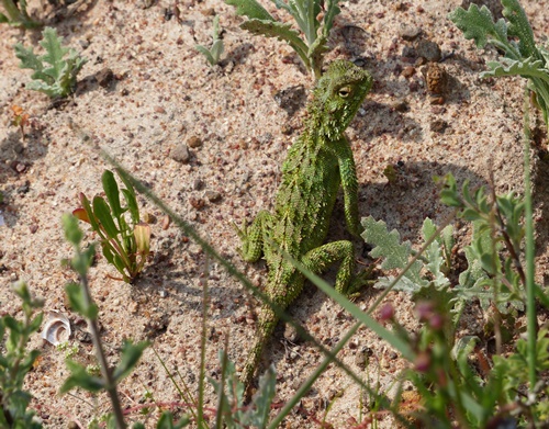 Schon nach ein paar Minuten nutzen wir die erste Möglichkeit, um an den Strand zu gelangen. Dort erwartet uns eine typische Strandveld-Vegetation und wir finden gleich wieder ein paar für uns neue Arten. Das Strandveld ist eine von fünf Unterabteilungen der Fynbosvegetation nördlich von Kapstadt. Die einzelnen Vegetationszonen sind einerseits höhen- andererseits bodenabhängig. Strandnahe Gebiete bestehen aus kalkreichem Sand einer früheren Meeresüberflutung mit vergleichsweise vielen Nährstoffen. Die anderen Fynbos-Typen haben entweder andere Böden wie Sandstein, Lehm oder Granit oder wegen ihrer topographischen Lage andere Niederschläge. Daher sind viele Arten lokal auf diese Lebensräume begrenzt, einige sogar endemisch.