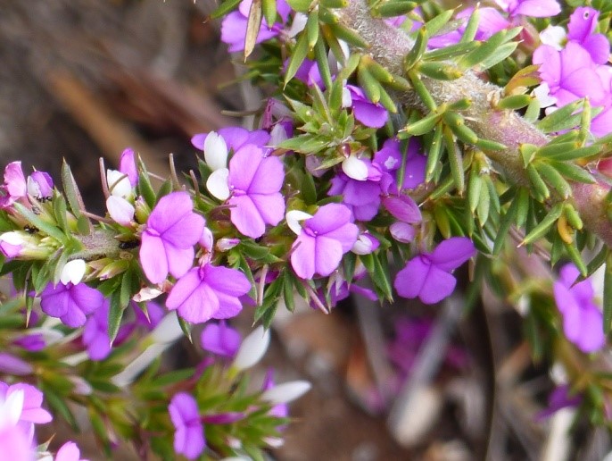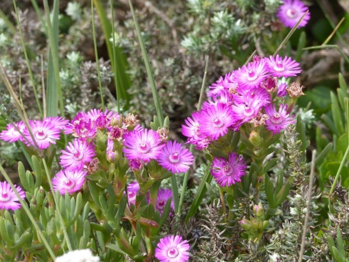 Es ist high noon, als wie den Strand nach etwa einer halben Stunde verlassen. Die Weiterfahrt währt nur kurz, denn violette Teppiche von Mesembs bedecken große Flächen, und wir halten an. Mittagsblumen, wohin das Auge auch schaut und erst bei genauem Hinsehen entdeckt man auch viel „Kleinzeug“ dazwischen, das von der Wucht der Farbe erst einmal erschlagen wird.