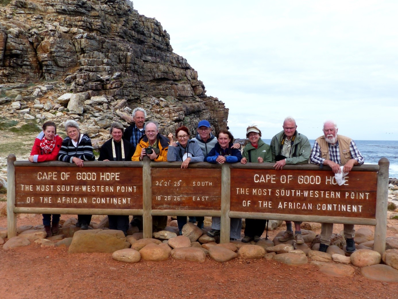 Der Himmel klart zusehends auf, einer Fahrt zum Signal Hill steht also nichts im Wege. Es ist das letzte offizielle Ziel unserer Reise. Nach etwa einer halben Stunde Fahrt haben wir den Gipfel erreicht und reihen uns am Bus für ein letztes Gruppenfoto auf. Die Sicht zum Tafelberg ist frei, zumindest meistens, ziehende, tiefe Wolken schieben sich schon mal dazwischen, aber es bleibt trocken und ist meist sonnig. Auch der Wind ist fast weg. Ein halber Tag Regen auf der gesamten Reise – Schwamm drüber!