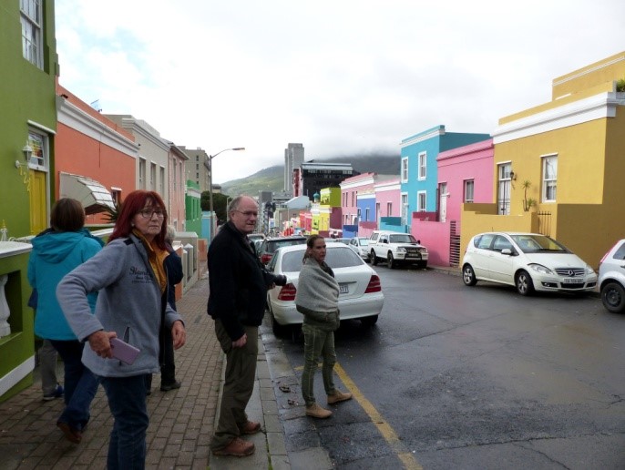 Dabei handelt es sich um ein Stadtviertel mit vielen kleinen bunten Häuschen aus der Gründerzeit von Kapstadt. Die Farben wurden deshalb so bunt gewählt, weil damals fast keiner der Bewohner lesen konnte, Hausnummern wären also vergebens gewesen. So hatte jedes Haus „seine“ Farbe. Die Bewohner waren zu dieser Zeit Arbeiter aus vielen Ländern auch außerhalb Afrikas, die als Billig-Kräfte im Company Garden eingesetzt wurden, um ankommende Schiffe mit frischen Lebensmitteln zu versorgen. An dieser Ausbeutermentalität hat sich bis heute nichts geändert. Wir steigen in einer Regenpause aus. Aber kaum losgelaufen, kommt schon wieder ein Platzregen und Chris muss kommen, um uns wieder einzusammeln. Wir hatten zwischendurch einen Unterstand gefunden.