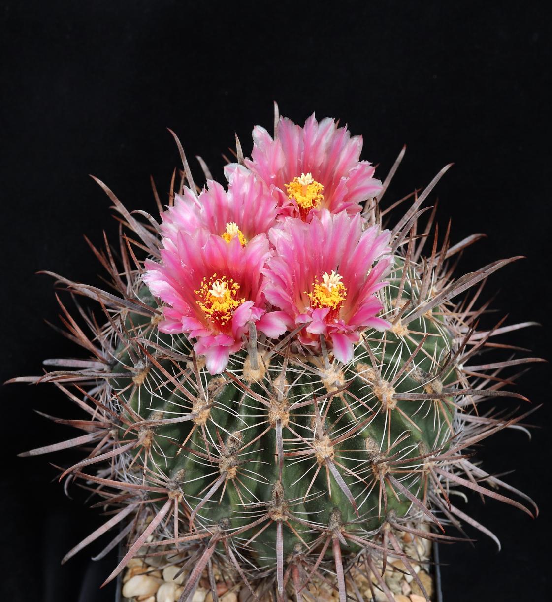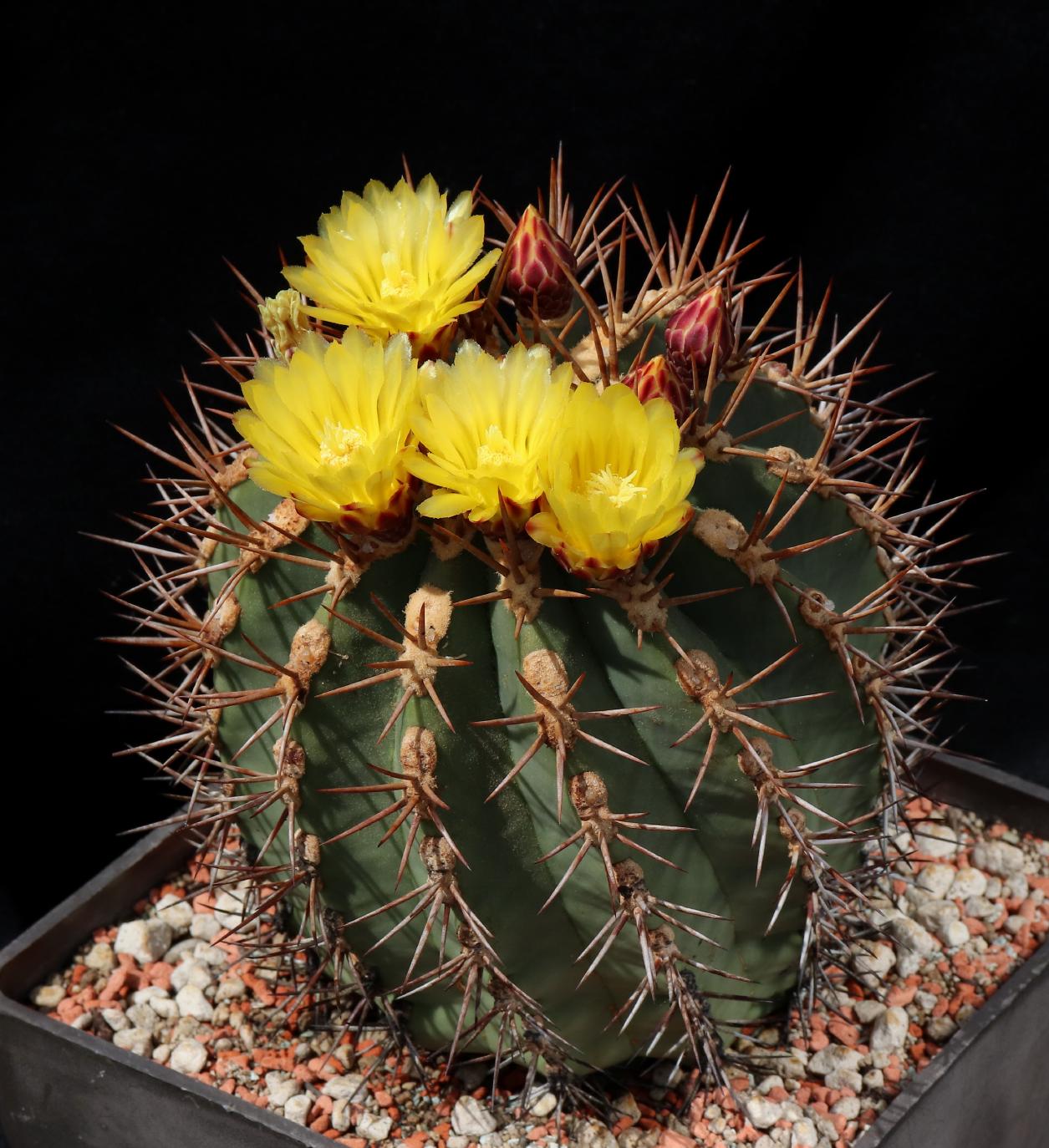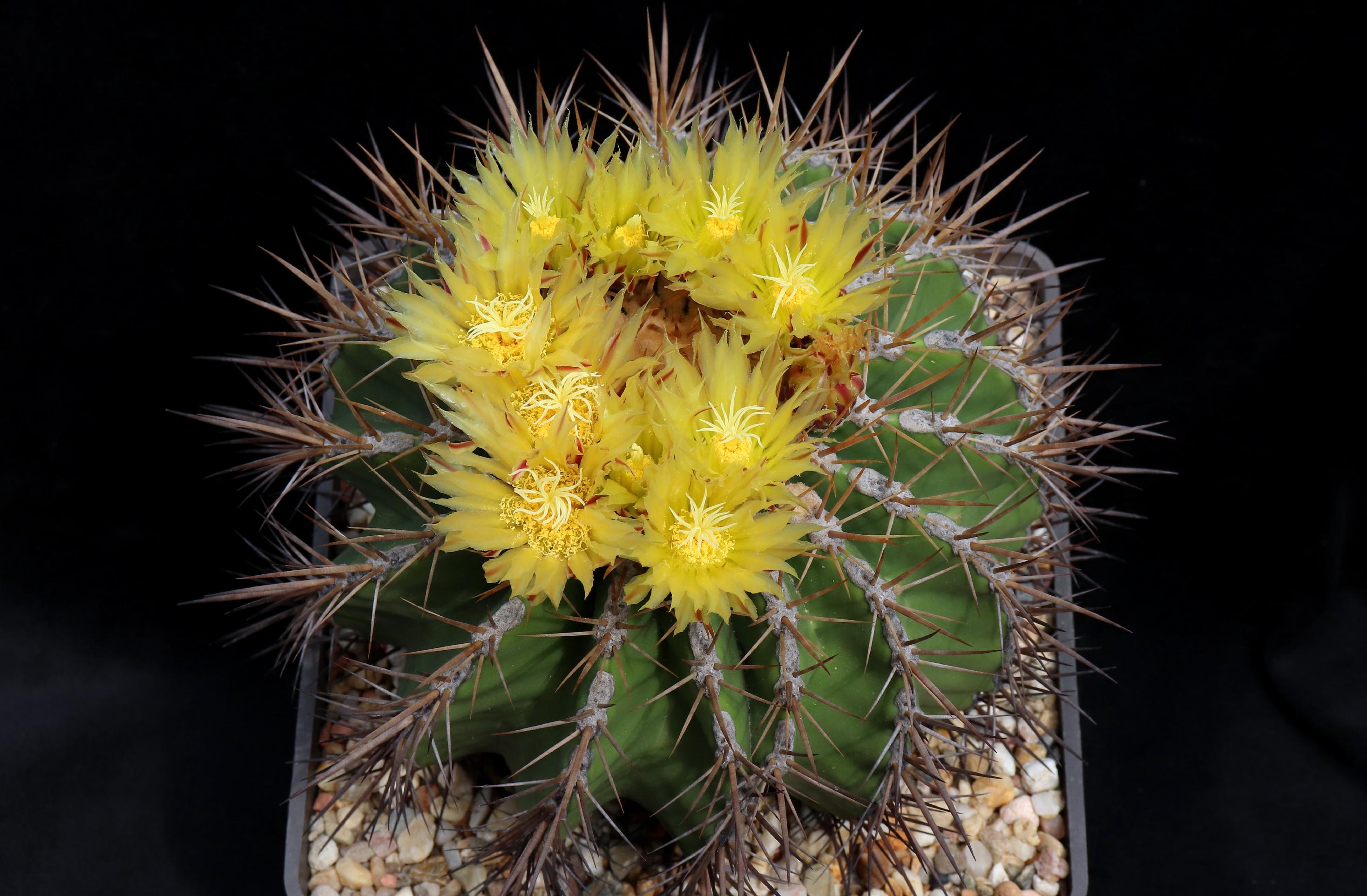 1985 als Ferocactus gracilis (de Herdt-Samen) ausgesät, und schon hat die Pflanze am letzten Wochenende zum ersten Mal geblüht.