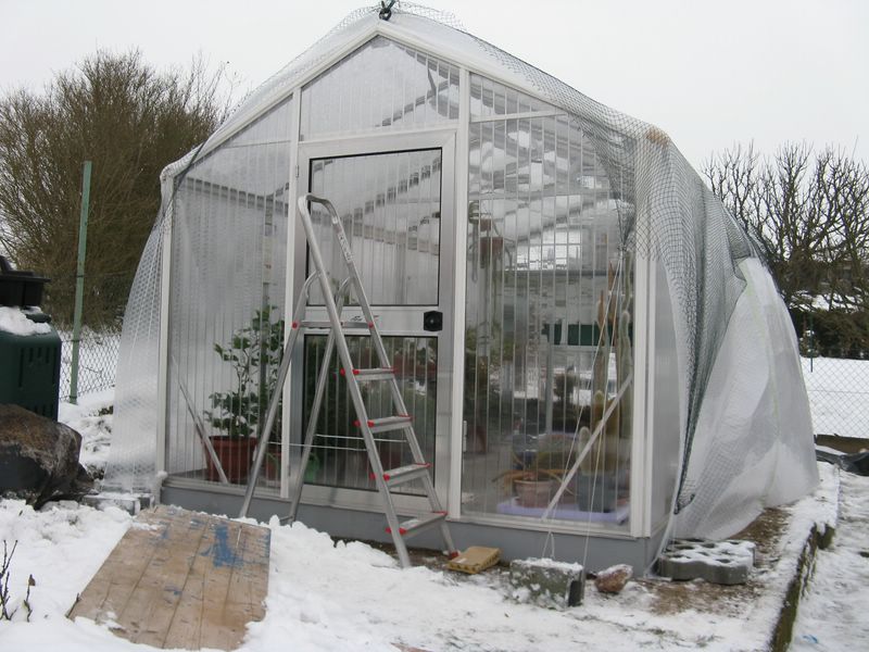 Der Stromverbrauch liegt seit Beginn des Winters nun schon bei 950 kw/h, zurzeit kommen ca. 24kw/h/d hinzu. Und eine Änderung des Wetterlage ist auch nicht in Sicht. So haben wir uns dazu durchgerungen, das GH nun doch noch mit Folie einzupacken. Diese Aktion fand gestern statt. Bei -1.7°C und immer mal wieder kleinen bis mittleren Windböen zwischendurch war es nicht wirklich eine Freude. Man hätte statt 4 Händen eher das Doppelte gebraucht. Anbei ein paar Eindrücke vom winterlichen Einpacken. Nach etwas mehr als 4h waren wir zwei ziemlich durchgefroren, aber endlich fertig. Über Nacht gab es gleich den ersten Stabilitätstest mit Ostwind Stärke 4-5. Hat fast alles gehalten, bis auf die Türabdeckung. Dort werden wir wohl die Folie von innen anbringen müssen. heute hat es den ganzen Tag geschneit wie verrückt, ein Glück, dass wir das gestern gemacht haben