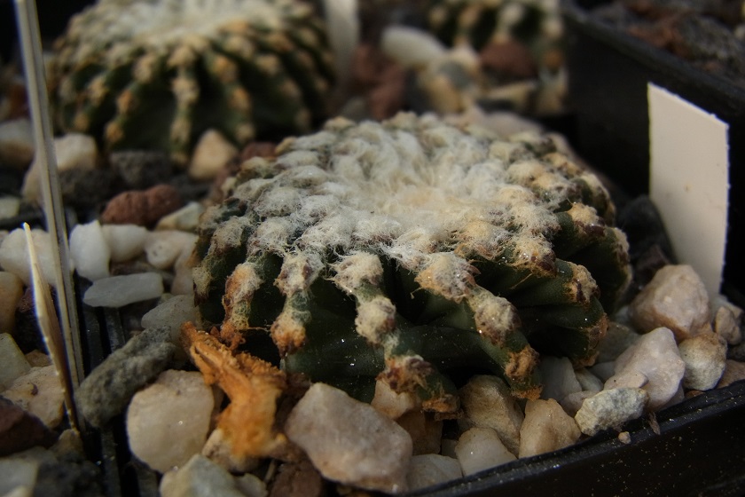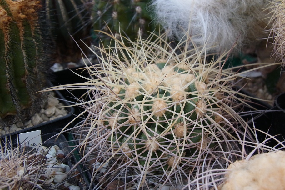 Die zweite stammt von M Halfar, dem die Pflanze wohl selbst nicht auf dem eigenen Verkaufstisch aufgefallen ist. Mir hat sie sofort ins Auge gestochen, durch Form und Farbe der Bedornung, anders gesagt, ihren Habitus. Auf den ersten Blick glaubte ich, es wäre wohl ein Gymnocalycium (das ist doch Deine Sparte), aber davon bin ich sehr schnell abgekommen. Ganz klar fällt sie aus dem Rahmen. Nun hat sie Scheitelwolle ausgebildet, was einen Discocactus erkennen lässt.