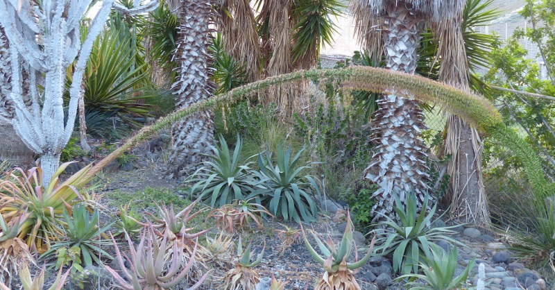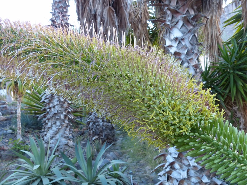 dem Foto sehen könnt, Blütenstand von ca. 4m Höhe ( Länge). Der Blütenstand bildete sich im Dezember 2020, Blüten dann im Februar 2020 und jetzt im März bildet sich am Ende der Fruchtstand, bis die Früchte reifen, braucht es noch einen Monat.