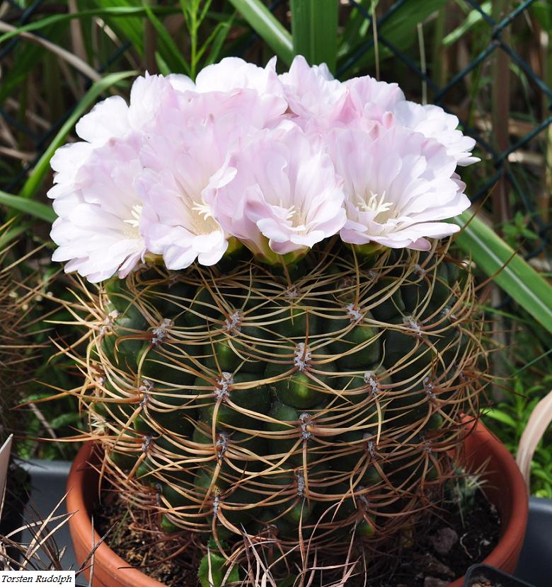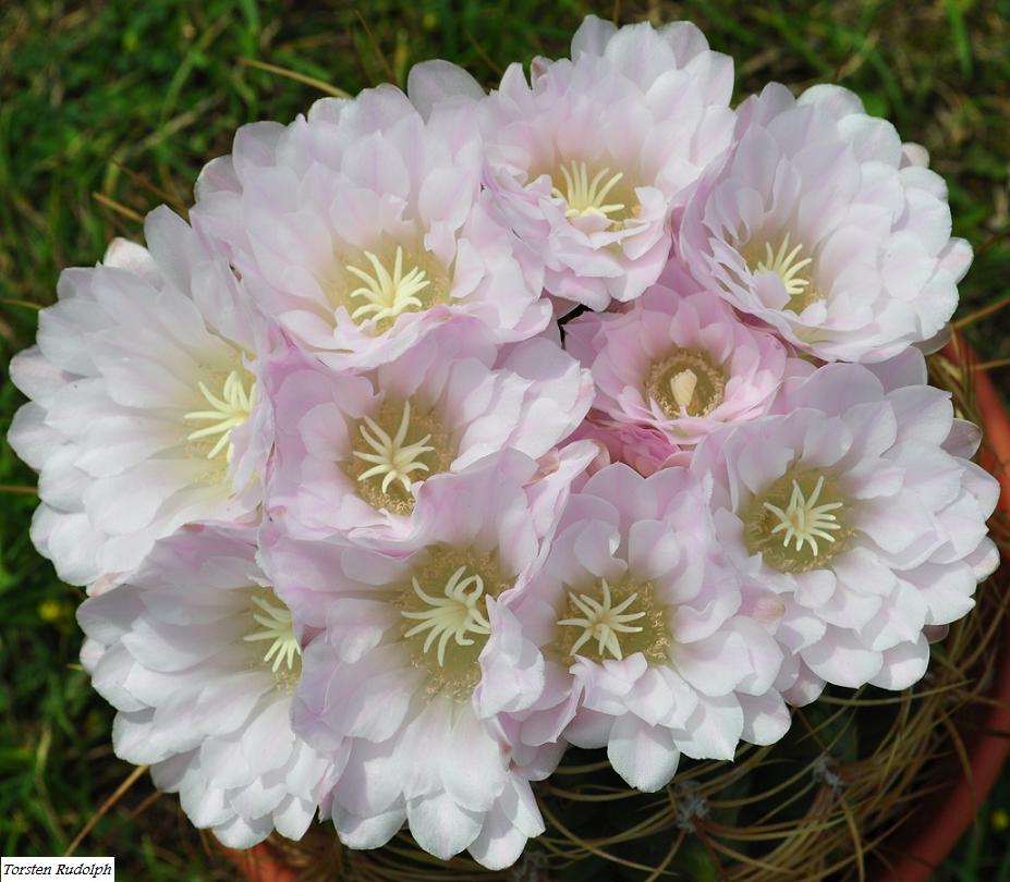 hier mal mein Gymnocalycium monvillei mit 10 Blüten im Scheitel.