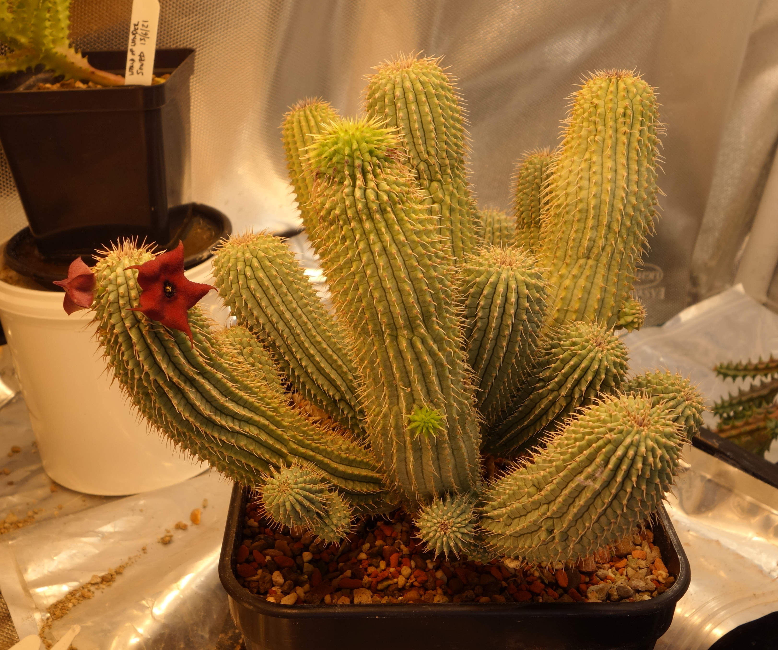 I went through Meve's Illustrated Handbook of Succulents Plants and it seemed to have some quality of every species of section Trichocaulon and several from section Hoodia. It is likely that the mother was H. flava, which would explain why they were sold as H.flava. They are very short, only getting to 15cm, very convenient for my growing space.