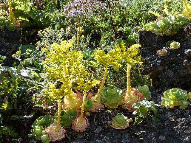 Am Rande von Lorbeerwälder blühene Aeonium undulatum und zwei Aichryson Species.