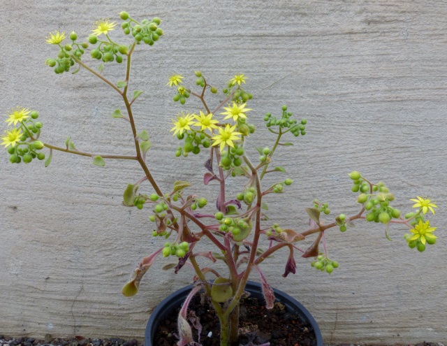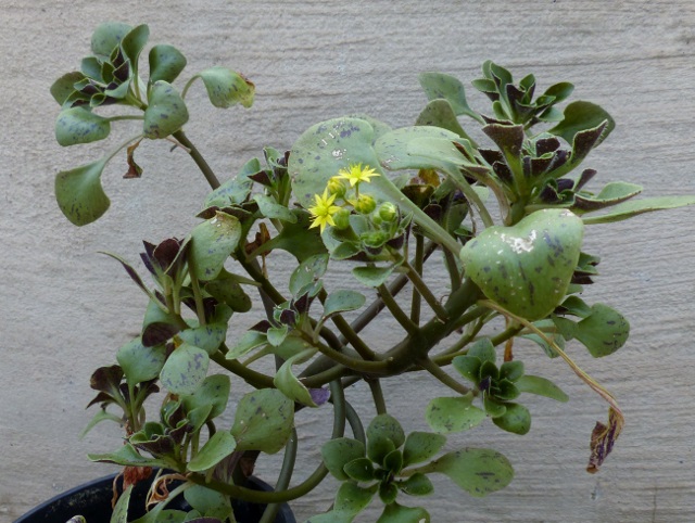 Aeonium aureum und viele tausende Aeonium simisii in Blüte, dabei eine Cristate- in dreißig Jahren noch nie gesehen.