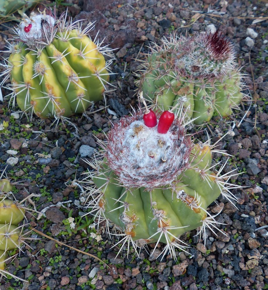 Melokakteen viele Spezies: Im allgemeinen kleine rote längliche Früchte; schmackhaft.