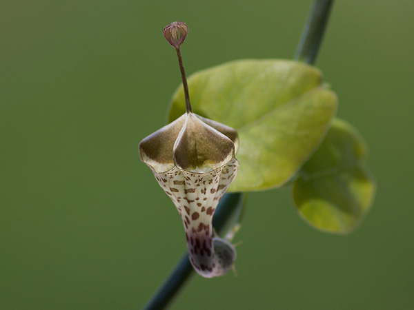 Die Blätter sind etwa 2 bis 3 cm lang, die Blüte selbst ist 3,5 cm lang, innen und außen offensichtlich völlig unbehaart und duftet sehr leicht sandelholzartig/seifig.