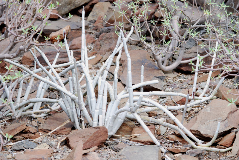 ... waren wir an einem küstennahen Standort, an dem Ceropegia fusca in erfreulich großer Zahl wächst. Das war der botanische Höhepunkt der Reise. Auf einem einzigen schottrig-trockenen Hügel in Gesellschaft von Euphorbia balsamifera, Lycium intricatum und Neochamaelea pulverulenta . Nach Eingewöhnung des "Suchauges" waren die weiß-grauen, etwa 1 cm dicken Triebe ohne Weiteres auf Entfernung auszumachen. Auf anderen Hügeln in der "Ecke", für uns eigentlich zum Verwechseln ähnlich, nichts zu finden. Stattliche Exemplare, teilweise in Blüte (dafür ist "offiziell" erst ab Februar bis März die richtige Zeit), aber auch jüngere. Traumhaft! Ohne ortskundige Hilfe hätten wir allerdings diese Nadel im Heuhaufen nie gefunden! Ein paar Bilder habe ich Euch mitgebracht: