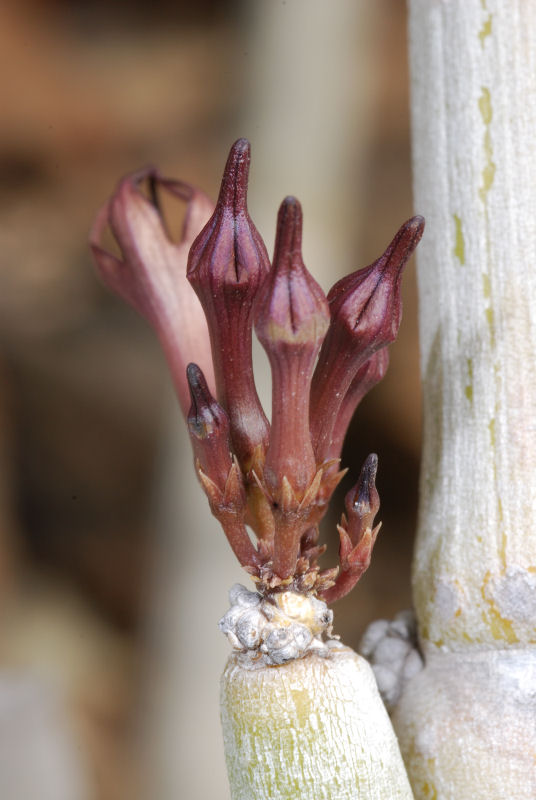 An einem zweiten Standort auf etwa 900 m Höhe sahen wir zufällig eine Pflanze am Wegesrand (!), schnell eine zweite in der Nähe – und nach einigem Suchen ein weiteres, jedoch eher schwaches Exemplar. Mehr war trotz ausgiebigem Suchen dort nicht zu finden. Dank der Regenfälle im November/Dezember trieben die beiden gesunden Pflanzen schöne junge Triebe. Das war auch am ersten Standort zu beobachten, allerdings nicht ganz so kräftig. Vermutlich hatte es dort nicht so viel geregnet.