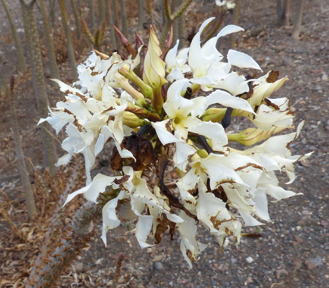 Seit 2024 blühen diese Pachypodien das erste Mal im Winter; Pflanzen ohne Blätter, Fotos März 2025.