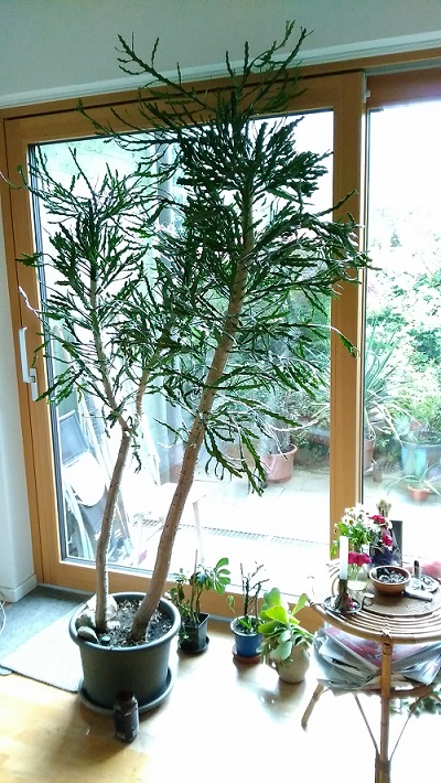 Habe eine zu groß gewordene Euphorbia grandidens zu verschenken (braucht großes Fenster, Oberlicht/Tageslichtlampe oder am besten Wintergarten, im Sommer draußen!), ist jetzt incl. Topf 2,10 m hoch. Abzuholen im Raum Freiburg i.Br. gegen Mithilfe bei der Teilung der Pflanzen (die kleinere, links im Bild, behalte ich noch). Bitte Nachricht per e-mail.