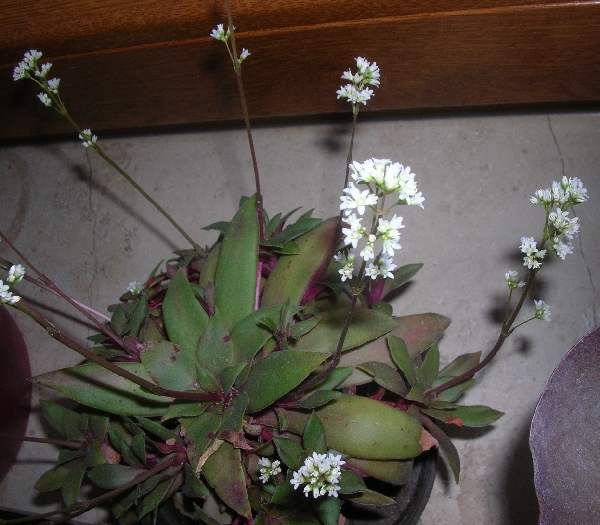 Diese Rosette erhielt ich letztes Jahr von einem Bekannten. Erinnert mich stark an eine Saxifraga, ist aber nicht winterhart. Hat 5-zählige Blüten und duftet angenehm. Blütezeit Dezember-Januar.