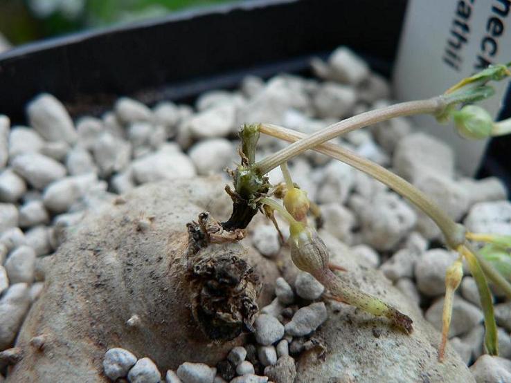 Als der Austrieb anfing zu wachsen habe ich vorsichtig gegossen, jedoch immer nur in die Ecken des Topfes, nie auf die Knolle. Die Pflanze wuchs rasch und begann bald zu blühen. Als ich gestern vor ein paar Tagen von der Arbeit kam war der Trieb plötzlich an der Basis schwarz und abgeknickt, am nächsten Tag völlig welk. Als ich nachschauen wollte ob die Knolle fault habe ich nur bemerkt, dass sie bereits fest bewurzelt ist. Fäulnis konnte ich nicht feststellen.