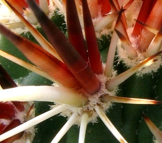 Detailansicht der großen Areolen, prächtig gefärbte Dornen