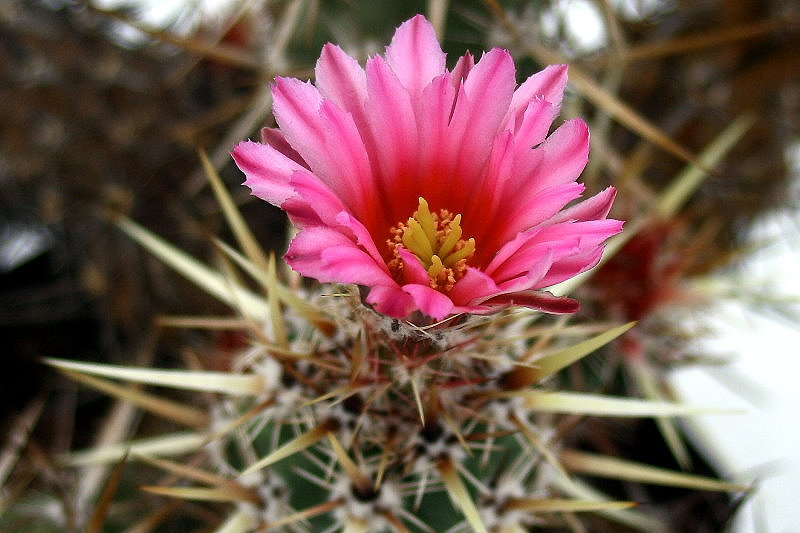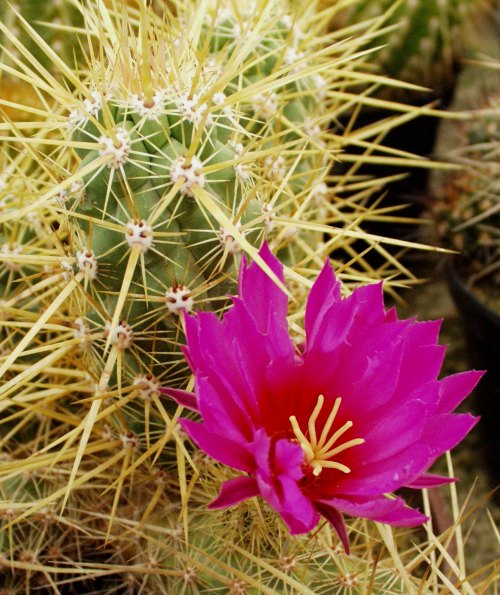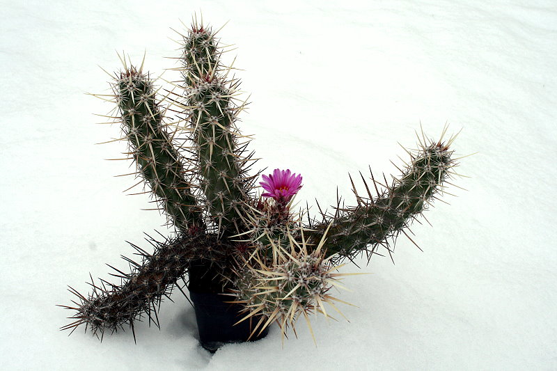 Als ich heute Vormittag im Gewächshaus in die oberen Regale schaute, traute ich kaum meinen Augen. Fast 25 Jahre ließ mich dieser Echinocereus brandegeei auf den ersten Flor warten. Nun bei Schnee und Kälte öffnete er seine erste Blüte!