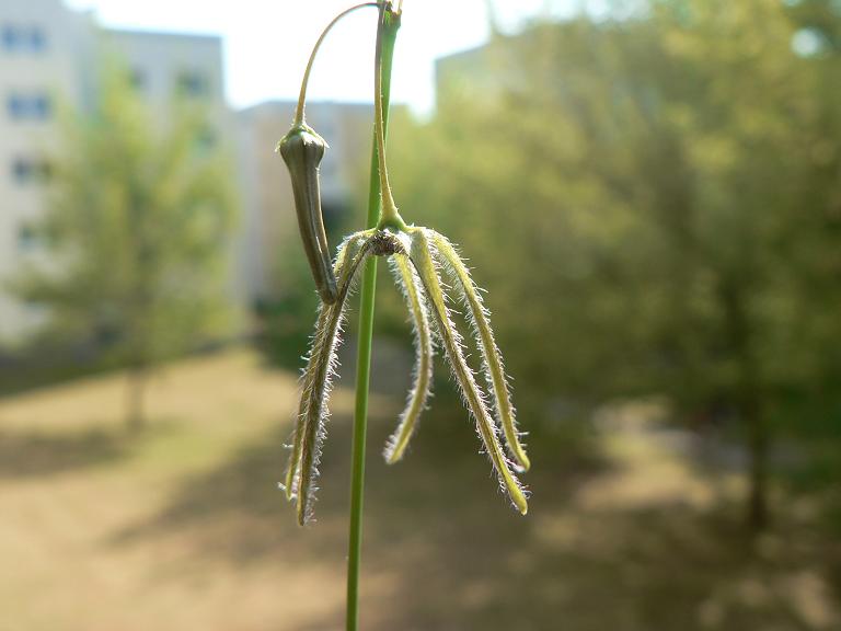 diese hübsche kleine Art habe ich als Brachystelma sp. Thailand erhalten. Besonders interessant an der Pflanze finde ich, dass sie kaum bzw. nur winzige Blätter hat. Auf den ersten Blick sieht man nur den Spross und die Blüten. Möglicherweise wird der Großteil der Photosynthese vom Spross selbst übernommen. Die hängenden Blüten erinnern am ehesten noch an B. gracile.