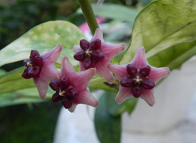 Bei mir blüht gerade eine Hoya lobbii "black". Hab sie mir dunkler vorgestellt. Obwohl sie im Vergleich zu den oben gezeigten Blüten schon recht düster ist...