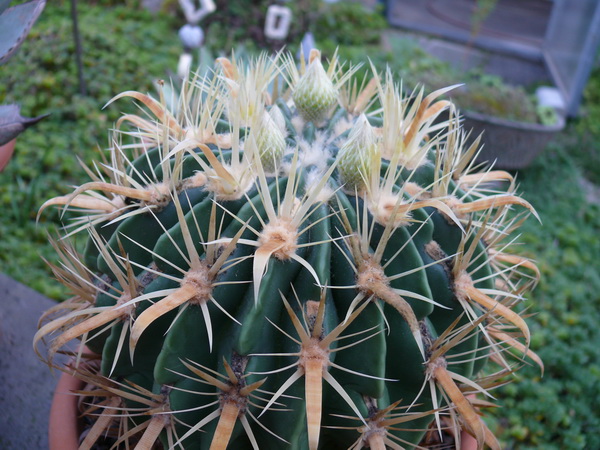 am 20. August habe ich schon mal über meinen gelbdornigen Ferocactus latispinus berichtet. Heute, gute 4 Wochen später, stelle ich noch mal ein neues Foto von ihm ein. Jetzt sind die Blütenknospen schon bedeutend größer. Auf dem ersten Foto konnte man nur mit viel gutem Willen diese entdecken. Die größte ist heute etwa 12 - 13 mm groß, also groß genug, um sie auf dem Foto zu erkennen.