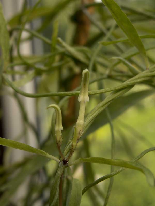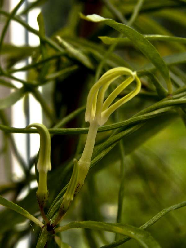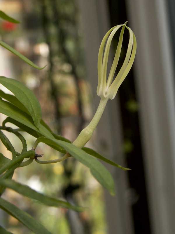 Ceropegia stenantha hat dicke Speicherwurzeln ähnlich wie arabica etc. . .Die Blätter sind schmal ca 7cm lang und der Stengel ist kantig. Kommt aus zeitweise überfluteten Standorten .Seit ich sie im Sommer sehr reichlich gieße wächst sie und will jetzt blühen.Hatte sie im Winter Totgeglaubt in ner trockenen Ecke stehen - hat trozdem wieder gut getrieben und blüht das erste mal.