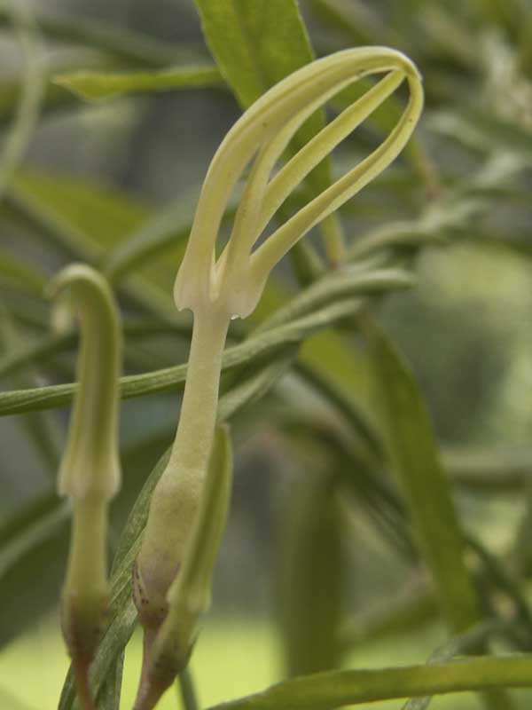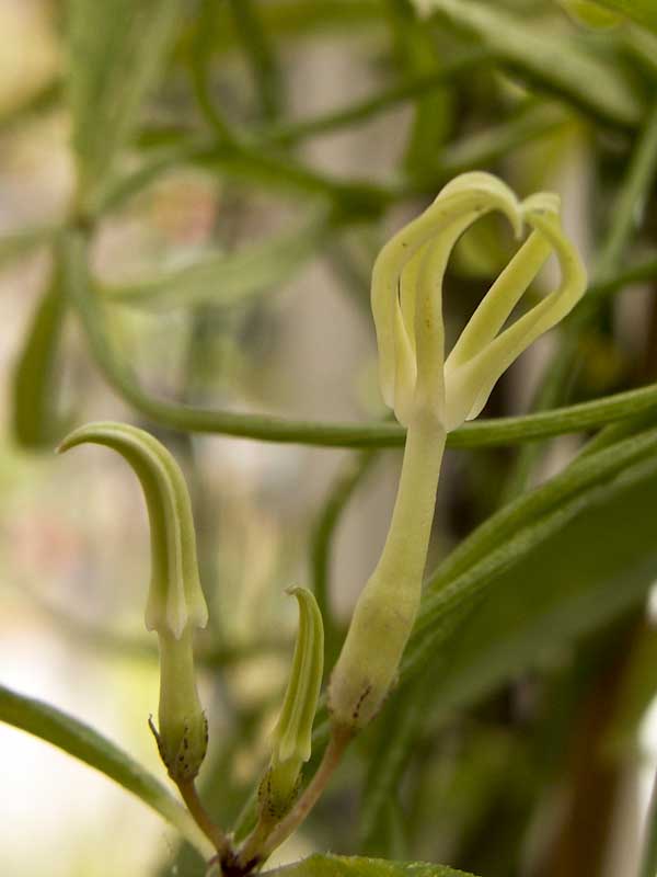 Die Art hat im Vergleich zur ähnlich wachsenden und blühenden C. floribunda oder die zumindest ohne Blüten ähnliche C. crassifolia lange fleischige Wurzeln und keine Knolle. Der unbehaarte Stängel wächst jährlich aus und windet mehrere Metter lang. Die Blätter sollen nach Dyer etwa 8-10 cm lang sein und schmal. Das passt gut zu Hildors Pflanze. Die Blüten brauche ich nicht zu beschreiben (sie sind bis 3 cm lang) - die Bilder sind sehr gut gelungen.