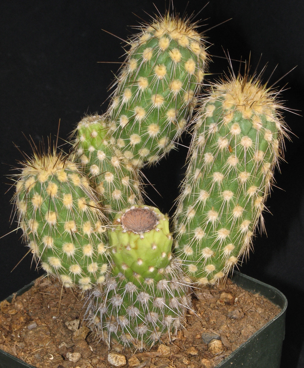 Ich habe allerdings gerade den Eindruck gewonnen, daß zumindest meine Pflanze selbst-fertil ist. Wo kommen sonst die Samen her, die ich kürzlich geerntet habe? Keine andere Opuntioide blüht bei mir im Winter. Ich bestäube jetzt jede Blüte per Hand mit sich selbst. Mal sehen, ob die nun alle dicke Fruchtknoten kriegen.