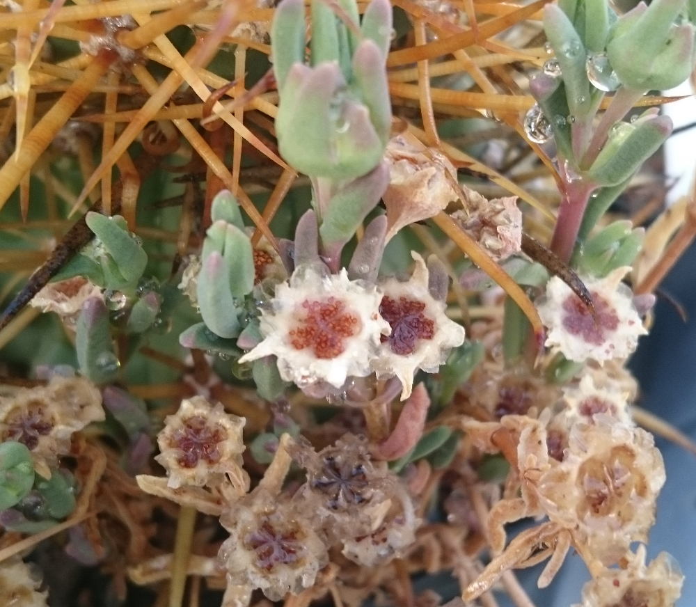 geöffnete Samenkapseln an Delosperma bosseranum, als "Begleitflora" im Topf bei Ferocactus.