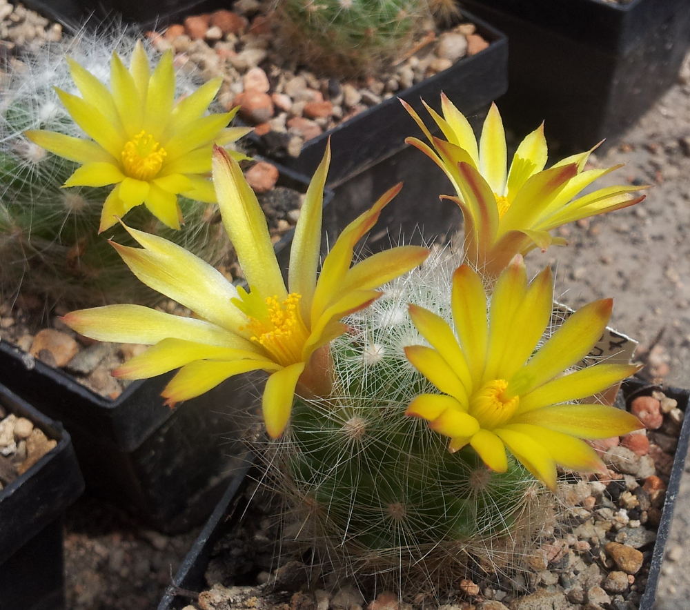 Im Moment blühen (noch) die M. baumii mit sehr schönen großen gelben Blüten: und oben auf der Hänge eine herrerae und eine mehrköpfige haudeana: