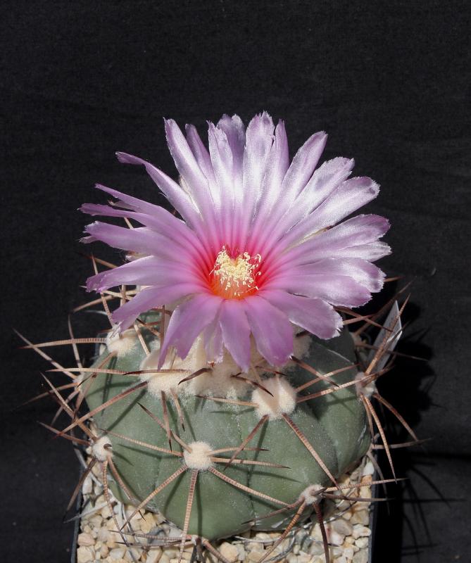 heute blüht bei mir ein Echinocactus horizonthalonius, den ich seit nunmehr 7 Jahren mit bestem Erfolg kultiviere. Er steht auf meinem Hochtisch in etwa zwei Meter Höhe über dem Boden und ca. 70 cm unter den Dachplatten in vollem Sonnenlicht. Hier blüht er mehrmals im Jahr. Er hat mit seinem Körper den 7-cm-Tieftopf seitlich schon überwachsen und dieser kann Feuchtigkeit nur noch über die Bodenlöcher aufnehmen.