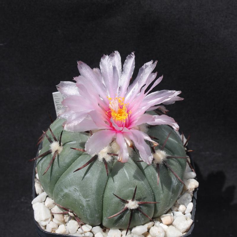 noch ein E. horizonthalonius blüht, dieses Mal mit einer ganz hellen rosa Blüte, fast weiß. Die Pflanze bekam ich vor einigen Jahren von einem Kakteenfreund geschenkt mit der Bemerkung:" Versuch mal, ob du damit noch was anfangen kannst". Der Kaktus war eine halbe Leiche, hatte er doch nur noch ein paar dicke, kurze Wurzelstümpfe. Zuerst nahm ich ihn aus dem alten und schlechten Substrat heraus und säuberte die Stümpfe, ohne sie zu verletzen. Dann wurde sie in mein mineralisches Substrat gepflanzt. Innerhalb kurzer Zeit erholte sich die Pflanze, neues Wachstum setzte ein und das Ergebnis waren dann auch Blüten. Daß es so helle Blüten waren überraschte mich. Eine genaue Herkunft ist mir unbekannt, aber ich weiß, wo ähnliche Pflanzen wachsen.