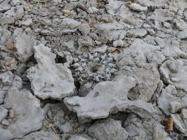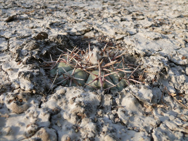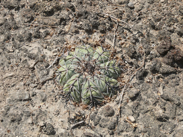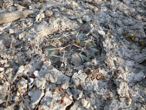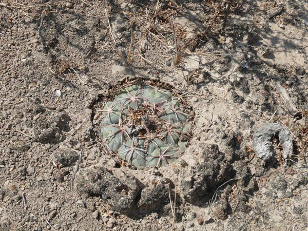 einige km westlich von Tula wachsen diese Echinocactus horizonthalonius. Die Bedornung ist ziemlich anliegend und kurz. Die Blütenfarbe ist etwas kräftiger, aber das kann von Pflanze zu Pflanze etwas variieren. Als Beipflanzen wachsen dort auch Unmengen von Ariocarpus kotschoubeyanus und wenige Lophophora koehresi. Es ist das nördlichste Vorkommen dieser Lophophora, die sonst nur weiter südlich in San Luis Potosi wächst. Ich war an diesem Standort Anfang März, da waren die Pflanzen noch tief in den Boden eingezogen und platt wie eine Diskusscheibe. Die Ariocarpen sollen weiße Blüten haben.