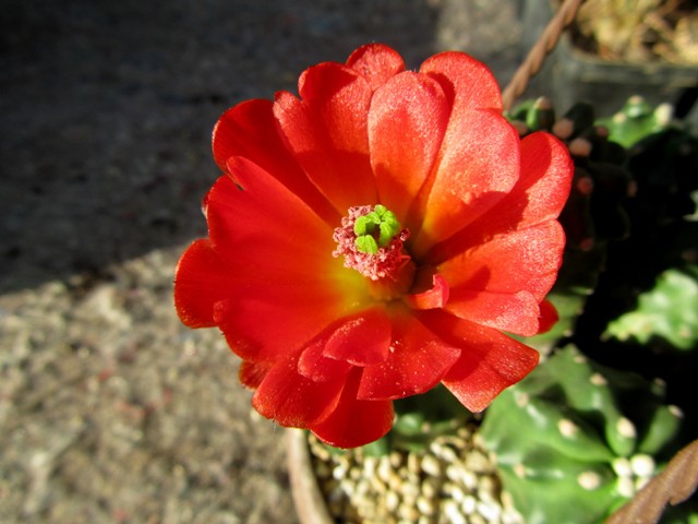 Hab seit Ende 2008 eine Opuntia rutila 'Super'. Nimmt viel Platz weg (50x50cm), verfügt über extrem fiese Glochiden und hat noch nie geblüht. Die Pflanze muss gespürt haben, dass die Sympathien so langsam schwanden und hat sich dieses Jahr erstmalig zur Blüte durchgerungen. Drei Blüten, jede Blüte überdauerte nur jeweils einen Tag, und an jedem Tag ging nur jeweils eine Blüte auf. Immerhin eine recht aparte, recht große Blüte (ca. 9cm Durchmesser):