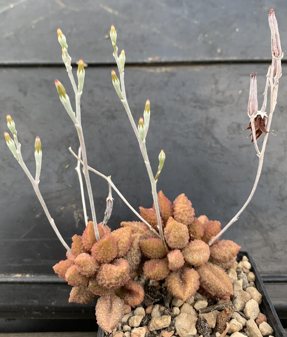 bei Adromischus sind ja eher die Blattform und -struktur interessant, die Blüten eher klein und eher unscheinbar. Von daher, ... Adromischus marianiae var. herrei: