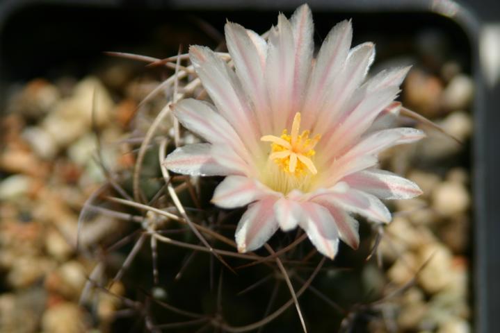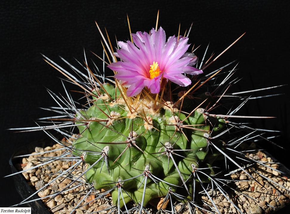 Noch keine drei Jahre alt und will schon blühen: Thelocactus tulensis mit der ersten Blüte