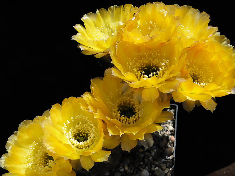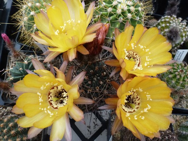 bei mir ist Lobivia calochrysea zur Blüte gekommen diesmal mit 3 Blüten die sich gleichzeitig geöffnet haben.