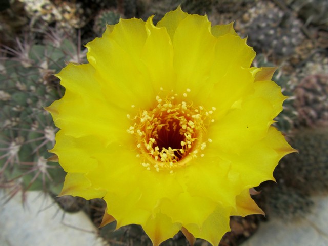 bei mir ist Lobivia calochrysea auch wieder zur Blüte gekomme, diesmal mit nur 2 Blüten.