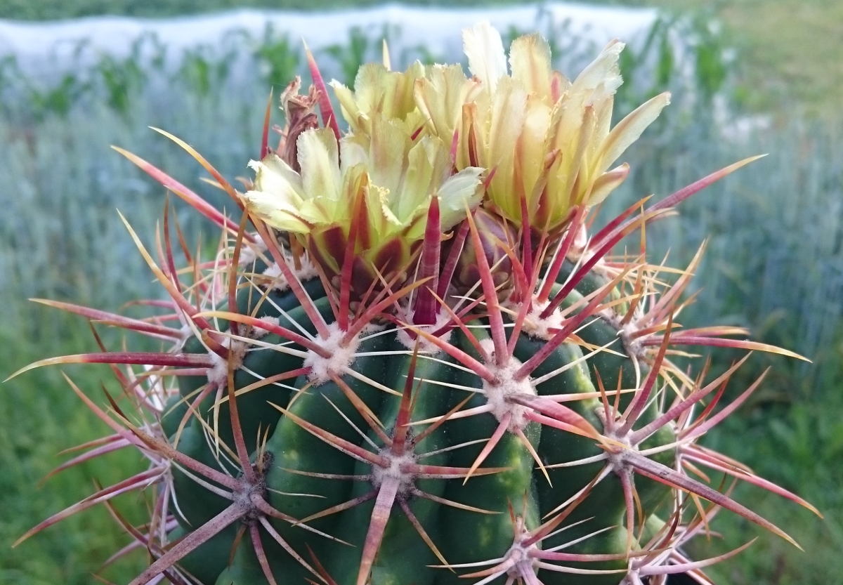 der oben schon gezeigte Ferocactus viridescens v. orcuttii (mit dem schönen roten Neutrieb) blüht derzeit. Nicht überragend schön (grüne Blüten), aber mit der Bedornung geht das schon in Ordnung.