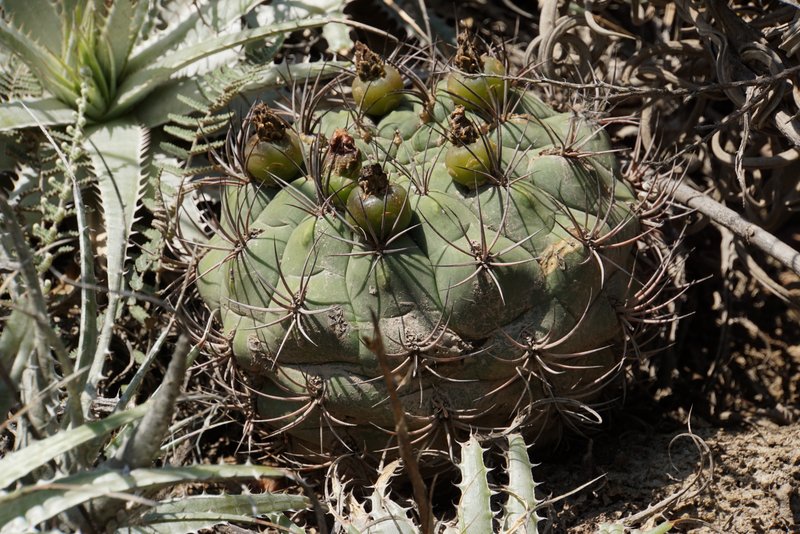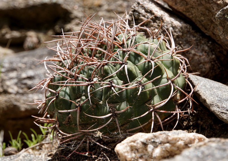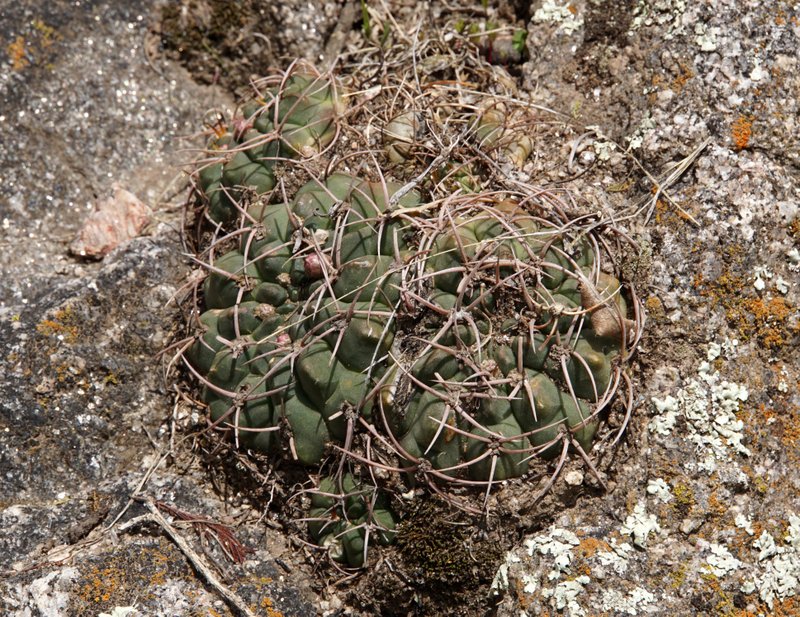 Tag 5: Catamarca - Miraflores - Cuesta de los Angeles - La Villa - Huillapima - Concepción (Sierra Ambato, Catamarca) An diesem herrlichen Morgen wollten wir die Cuesta de los Angeles, südlich von Catamarca besuchen. Gymnocalycium carminanthum soll es hier geben. Aber zunächst galt es, noch im Flachland bei Miraflores, das Gymnocalycium stellatum occultum aufzufinden. Gar nicht so einfach die Kerlchen zu entdecken und wir mussten erstmal ordentlich Blutzoll bezahlen. Dieses dichte Dornengestrüpp hat es in sich. Wenn man aber erstmal eines gefunden hat geht es Schlag auf Schlag. Unser erstes G.saglionis, das wir auch hier entdeckten, weckte wahre Begeisterungsstürme - was sich aber im weiteren Verlauf der Reise dank der Häufigkeit dieser Art schnell wieder legen sollte. Dann ging es auch schon hinein in die Berge. Wir hatten Glück - wenige Wochen vor unserer Ankunft wurde dieses schmale Sträßchen asphaltiert, dabei aber nicht ausgebaut, so dass die reich bewachsenen Straßenböschungen noch original erhalten wurden. Und da gab es vieles zu entdecken. Parodia microsperma catamarcensis in Massenbeständen, die bei der Rückfahrt am Mittag teilweise ihre hellgelben Blüten zeigten. Teils in voller Sonne, teils im tiefen Schatten, kopfüber hängend - wählerisch sind die Pflanzen wahrlich nicht. Auffallend die schwarzen Borsten an den Blütenkelchen. Die Parodien wachsen in einer Höhe von 700 - 1000m Höhe. Häufige Begleiter sind G.saglionis und Cleistocactus smaragdiflorus, letzter dank geöffneter Blüten leicht zu erkennen. Erst zu Hause beim Auswerten der unzähligen Fotos stellten wir fest, dass sich unter den zahllosen G.saglionis tatsächlich auch ein großes Exemplar von Gymnocalycium ambatoense, ein enger Verwandter von G.nigriareolatum und G.carminanthum eingeschlichen hatte. Unser Ziel heißt heute aber G.carminanthum - und da müssen wir noch einige Höhenmeter hinter uns bringen. Doch davon das nächste mal.