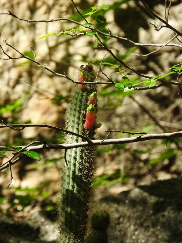 Die vielen Quittenbäume sind uns auch aufgefallen. Überall gab es "Dulce de membrillo". Übrigens meinte CABAC in Bezug auf G.occultum bei Miraflores die P131 (nicht P13). Dieser Standort wie auch die Cuesta sind offensichtlich sehr beliebt bei den Argentinienreisenden - wen wundert es, gibt es hier doch auf kürzester Distanz so vieles zu entdecken. Den Abschluss des Tages bildete eine Wanderung durch das Tal des Rio Pampichuelas, westlich von Conception, etwa 20 km südlich von Miraflores. Hier kann man auf einem schmalen Pfad entlang des Baches den Bosque (=Wald) de Arrayanes erkunden. In schwülheißer Luft windet sich der Pfad entlang des Baches durch subtropische Vegetation. Nicht unbedingt eine geeignete Umgebung um Kakteen zu finden. Aber es gibt ja auch noch die Epiphyten und schon bald fanden wir üppig mit Rhipsalis aculeata bewachsene Baumriesen. Papageien und knapp faustgroße Spinnen (keine Vogelspinne!) erinnern daran, dass wir nicht zu Hause sind. Gigantische Exemplare von Opuntia quimilo stehen hier in Blüte und an den felsigen Prallhängen des Flusses wächst Cleistocactus smaragdiflorus. Auf dem Rückweg wollte ich unbdingt nochmals G.occultum sehen. Also ging es bei Huillapima wieder rein ins Dornengestrüpp. Die Hitze war hier unerträglich und die heftigen Proteste meiner Frau waren durchaus berechtigt. Kein Windhauch sorgte für Abkühlung. Am Horizont ballten sich die Wolken über der Sierra Ancasti. Aber auch heute gab es wieder kein Gewitter. Wir waren uns einig - ein Fund reicht, dann gehts zurück ins klimatisierte Auto. Kaum war die Vereinbarung getroffen kam auch schon der erlösende Ruf aus dem Unterholz. Wunderschöne G.occultum waren Belohnung dieses Zwischenstopps. Ein Cleistocactus gab sich ebenfalls die Ehre. Morgen wird uns die Reise weiter nach Norden führen. Tafi del Valle in Tucuman ist das Ziel, doch davon später...