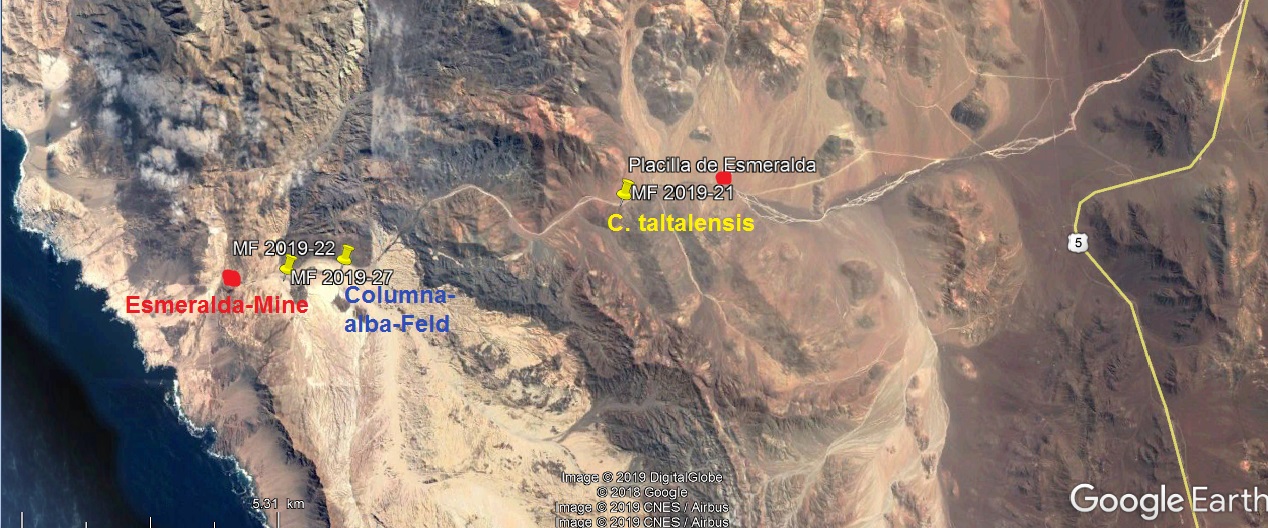 Da wir die Pflanzen auch (im Cachina-Tal) bei Placilla Esmeralda gefunden haben und dieses ebenfalls der Verbreitungs-Karte in COPIAPOA 2006 für Cop. taltalensis entspricht (Seite 71, der südliche Zipfel), habe ich eigentlich keinen Zweifel daran, dass es sich dabei auch um Cop. taltalensis handelt.