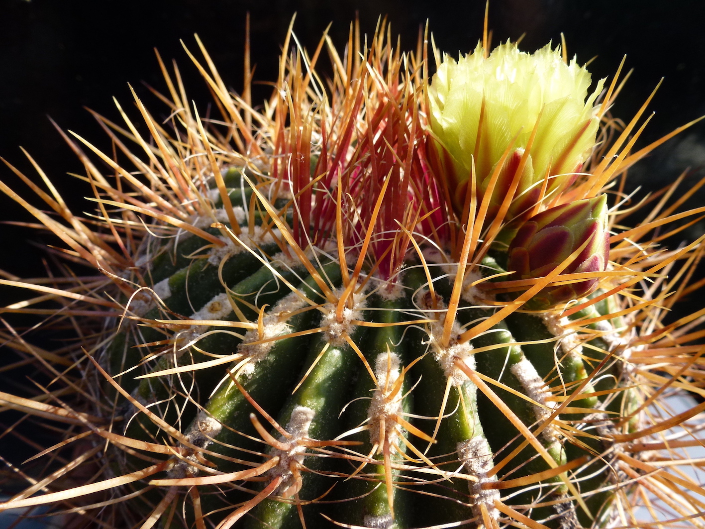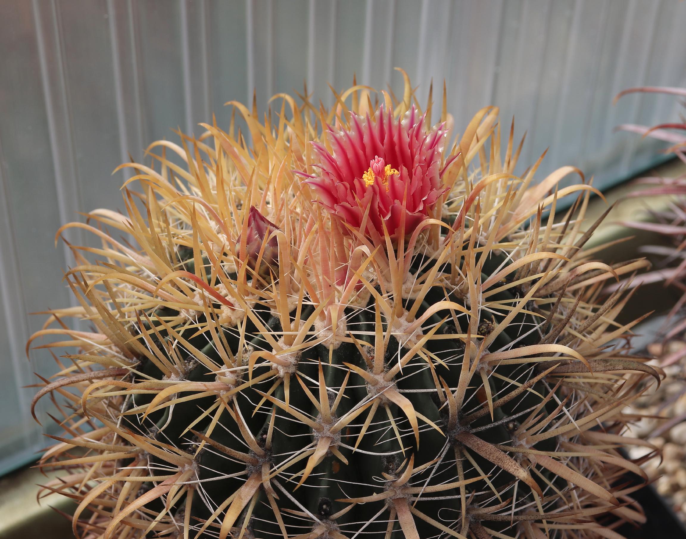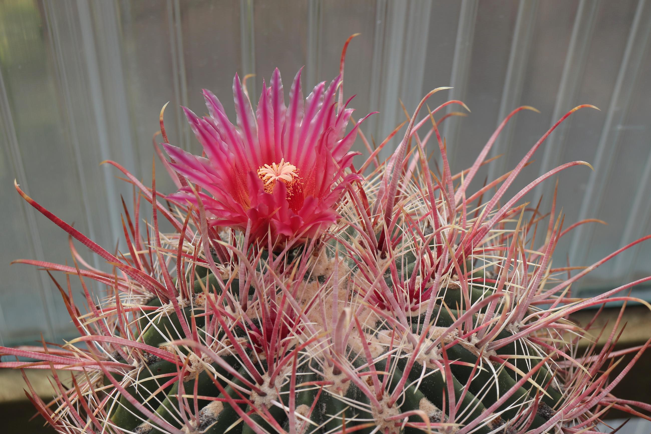 'Hatte schon oft Knospenansätze, hat heute aber zum ersten Mal eine Blüte durchgebracht: Ferocactus latispinus, Aussaat 1998