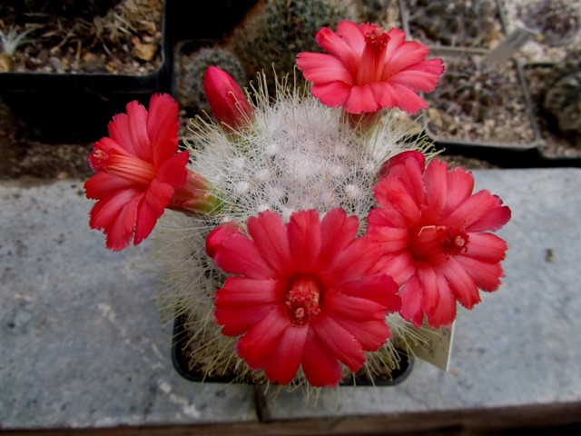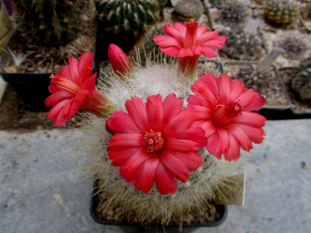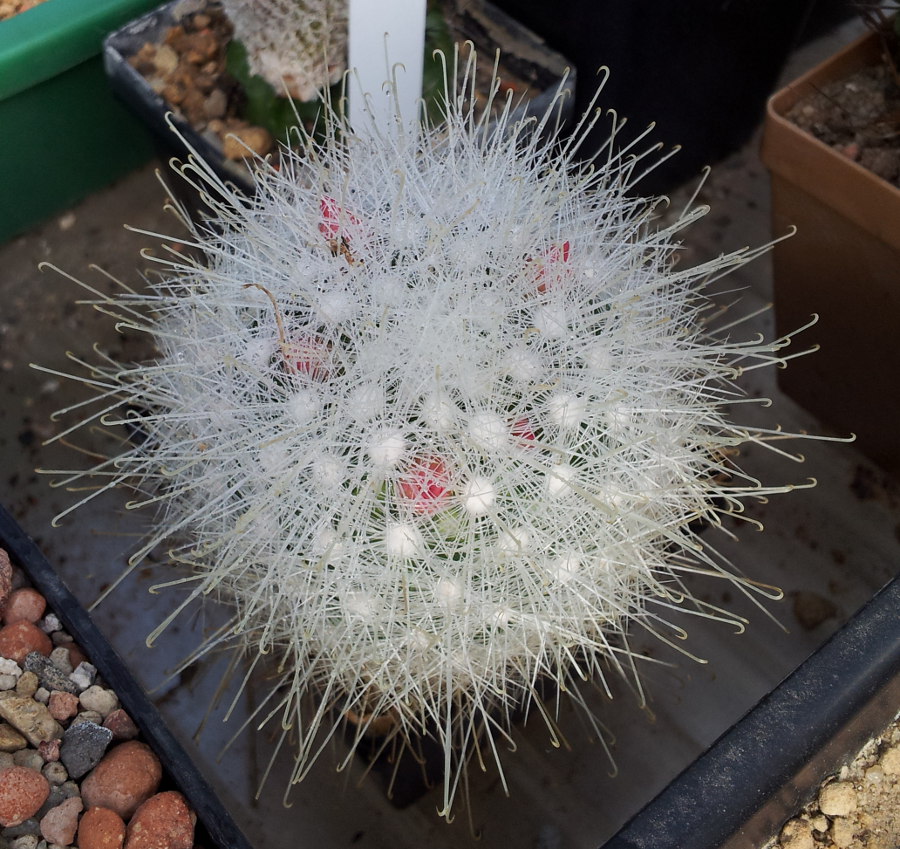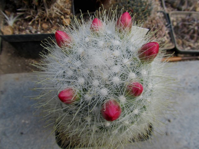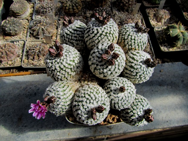 Deine Mammillaria sanchez-mejoradae ist einfach ein Traum! Ich beschäftige mich zwar nicht so sehr mit Mammillarien, aber diese Gruppe ist ein tolles Beispiel dafür, was passiert, wenn man eine Gruppe nicht auseinander reißt oder mehrere Sämlinge auf Dauer zusammen kultiviert. Es entsteht ein Polster, das zur Blütezeit in einem Blütenmeer versinkt.