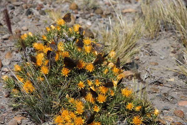 Die Chuquiragas in der Umgebung hatten eine geradezu magische Anziehungskraft auf die Schmetterlinge - es waren ganze Schwärme!