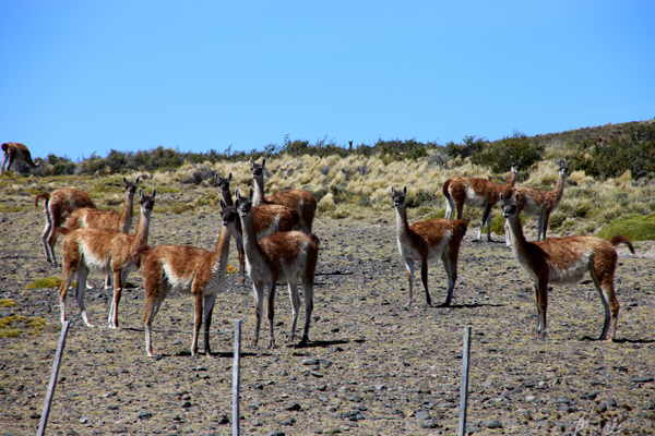 An der RN 40 südlich von Perito Moreno hatten wir noch eine ganz besondere Begegnung! In größerer Entfernung zur Straße beobachtete uns eine ansehnliche Guanako-Herde. Da ich natürlich gern ein schönes Foto von diesen Tieren machen wollte, versuchte ich ein wenig näher zu kommen. Um die Tiere nicht zu verschrecken ging ich ganz langsam und schaute möglichst immer auf den Boden. Sie ließen mich nicht aus den Augen, aber blieben stehen. So konnte ich allmählich ganz nah heran und in aller Ruhe fotografieren: