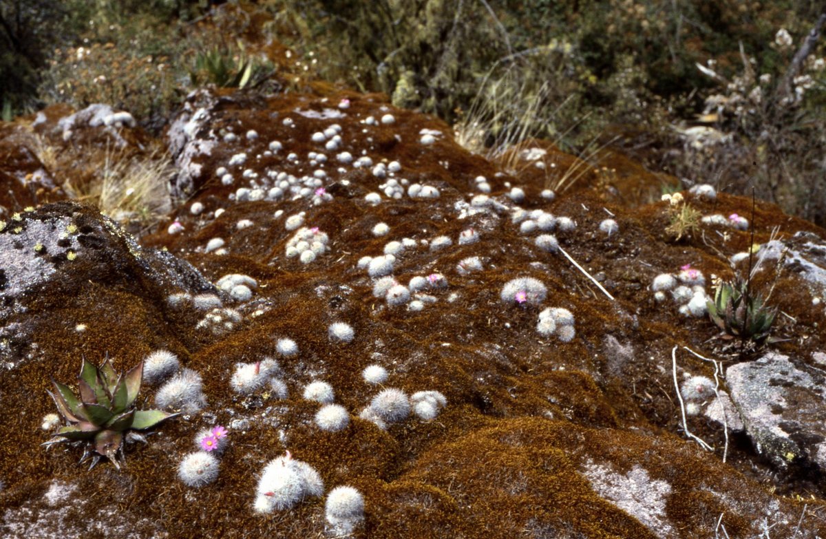 In den Gipfellagen bei über 2700m finden sich offene Kalksteinformationen mit dichtem Moosbewuchs. Diese sind mit hunderten von Mammillarien bevölkert. Wir haben tatsächlich die dodsonii entdeckt, viele davon sogar in Blüte (es ist Januar).