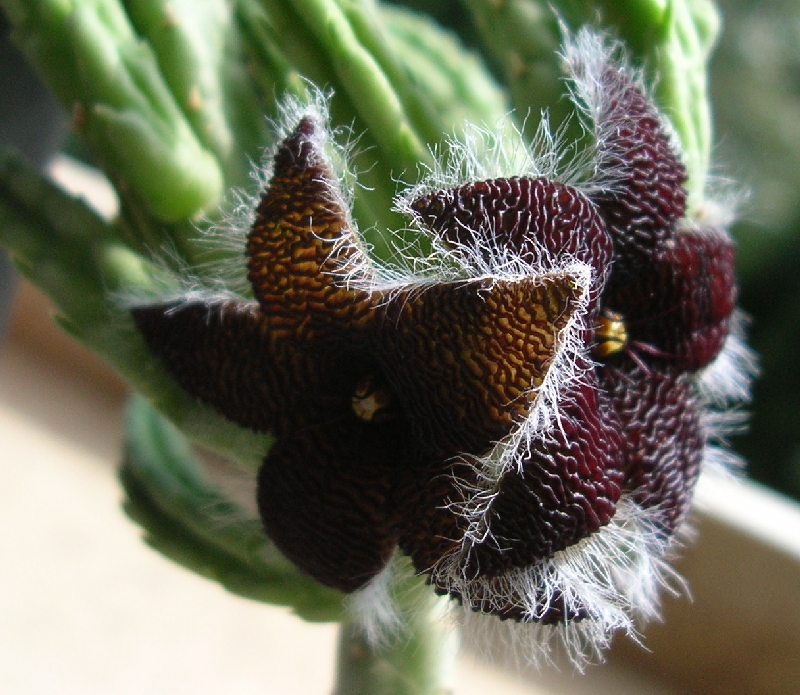 Die JHV in Berg war sehr schön und wie immer gab es tolle Pflanzen zu bestaunen und mitzunehmen. Iztok Mulej hatte diese wunderbaren Stapelia olivacea dabei: Vergleichsweise grazile Pflanzen mit schlanken Trieben, die sich gerne kandelaberartig verzweigen. Sie sehen dann wie kleine Bäumchen aus. Die Blüten sind 2,5 - 3 cm im Durchmesser und riechen unangenehm nach Bock oder so ähnlich. Besonders attraktiv ist der Kontrast zwischen den fast schwarzen, ledrig genarbten Blüten und den feinen, wolligen weißen Haaren.