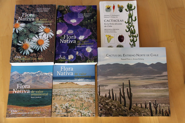 Bei der Pflanzenliteratur ist das Werk von Adriana E. Hoffmann und Helmut E. Walter "Cactaceas - En la flora silvestre de Chile" fast schon ein Standard. Auch die Flora Nativa de valor ornamental Ausgaben von Paulina Riedemann, Gustavo Aldunate und Sebastián Teillier gibt es wohl nur in Chile zu kaufen - leider. Wir kennen nichts besseres, wenn es um die Bestimmung von nicht sukkulenten Pflanzen in diesem Land geht. Zusätzlich gibt es jeweils ein Heft mit Ausflugstipps und genauer Routenbeschreibung. Auch diese Ausgaben gibt es untereteilt nach norte, centro und sur, zusätzlich gibt es noch eine Ausgabe für die "zona andina".