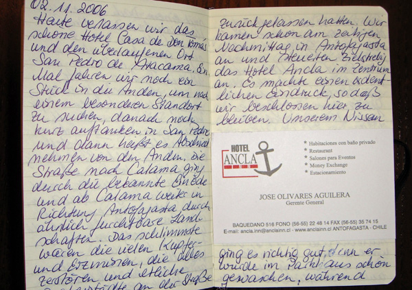 Bei allen Reisen haben wir immer einen Klebestift und Klebefilm bei uns, weil wir in das Tagebuch auch "kleine Erinnerungen" wie Visitenkarten von Hotels und Restaurants, die sonst schnell verloren gehen, sofort einkleben. Wir haben gemerkt, dass wir es nach einer Reise noch nie geschafft haben so etwas nachzuholen. Also machen wir es sofort. Das ist beispielsweise auch später sehr hilfreich, wenn man nach einer Unterkunft gefragt wird oder selber noch einmal dorthin fahren möchte. Man hat alle verfügbaren Daten und kann beizeiten Kontakt aufnehmen.